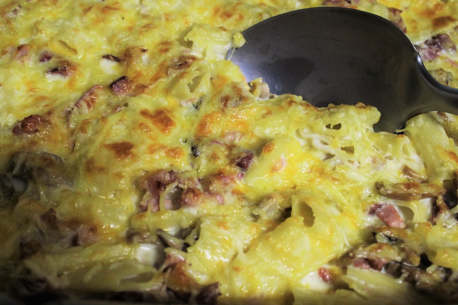 Numa taça à parte junta-se o molho bechamel e as natas, para depois se juntar ao preparado da frigideira. Mistura-se tudo muito, muito bem e coloca-se num tabuleiro. A seguir coloca-se o queijo ralado por cima e vai ao forno para alourar. Quando estiver com uma cor mais dourada, então podem servir a delícia das vossas vidas!